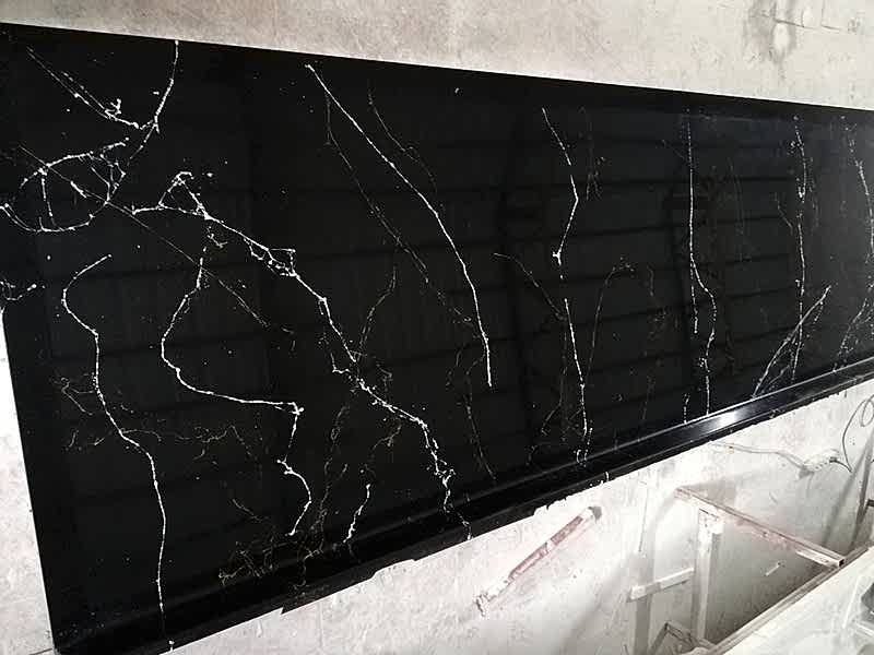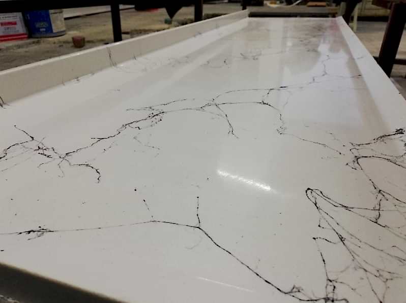 Beyaz zemin üzerine doğal mermer görünümlü siyah damarlı desenleri ile şıklık ve yüksek kaliteyi mutfak tezgahlarında bir araya getirdik.
